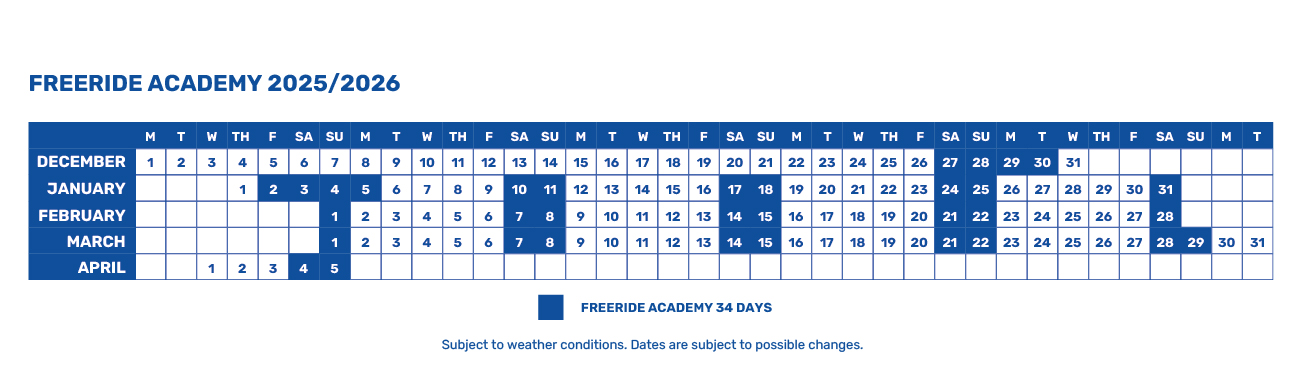 The Freeride Academy Competition is the perfect programme for young skiers and snowboarders who want to take freeriding to a competitive level. In addition to intensive technical training in off-piste terrain, the programme includes physical preparation, competition strategies and participation in official events, all under the supervision of a team of professional coaches.