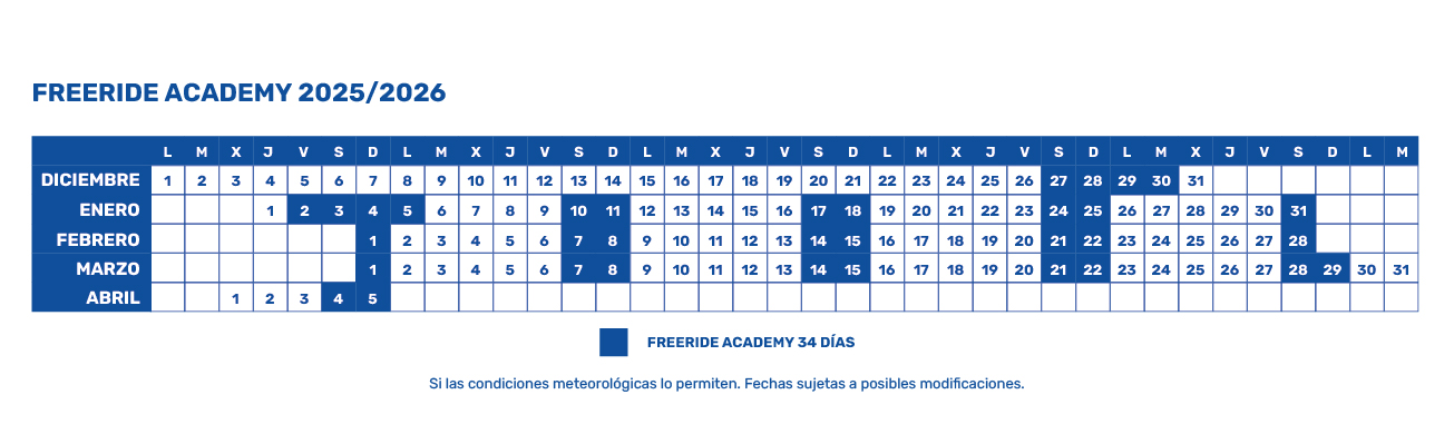 La Freeride Academy es un programa diseñado para jóvenes y adolescentes que quieren llevar su técnica de esquí o snowboard a un nivel superior, desarrollando habilidades avanzadas en terreno fuera pista en un entorno seguro y supervisado por profesionales. A través de un completo programa de sesiones semanales, los participantes aprenderán a moverse con confianza en todo tipo de condiciones y terrenos, mejorando su nivel técnico y su seguridad en la montaña.